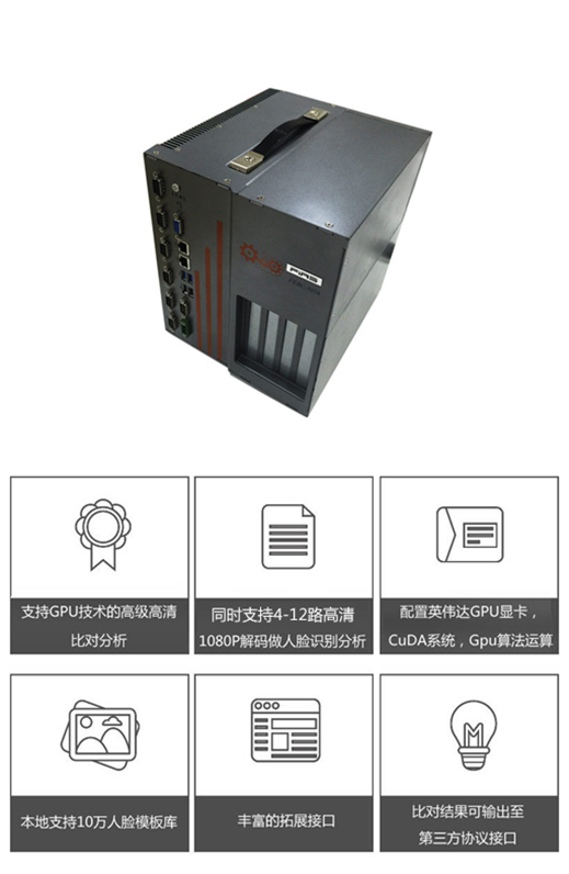 产品具备同时进行4-12路的高清1080P解码做人脸识别分析;采用GPU显卡的图像处理能力;
